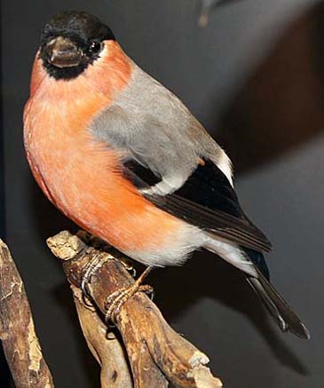 Pyrrhula pyrrhula Das Verbreitungsgebiet dieses Singvogels erstreckt sich von Nordafrika und Europa über das nördliche Asien bis Japan. Bevorzugte Lebensräume sind Nadelwälder, Mischwälder sowie Parkanlagen und Gärten mit Nadelbäumen. Hauptnahrung sind Samen, Früchte und Knospen. Je nach Region sind Gimpel Stand- oder Strichvögel, vor allem die nördlichen Populationen ziehen süd- und westwärts. Im 19. Jahrhundert war die Haltung und Zucht des Gimpels als Käfigvogel weit verbreitet. |