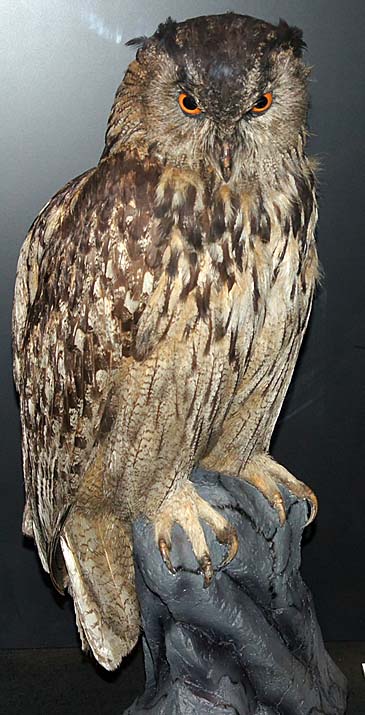 Uhu Bubo bubo Weedern, Masuren/Ostpreußen, 1899 Die größte Eulenart lebt in Nordafrika, Europa und Teilen Asiens. Uhus sind nachtaktiv und jagen kleine bis mittelgroße Säugetiere und Vögel. Mitteleuropäische Uhus brüten vor allem in Felswänden. Uhus benötigen strukturreiche Landschaften mit einem ausreichenden Nahrungsangebot. Durch intensiven Schutz der Horste und Wiederansiedlungsprojekte in verschiedenen Teilen Deutschlands haben sich die Bestände in Deutschland wieder erholt. |
