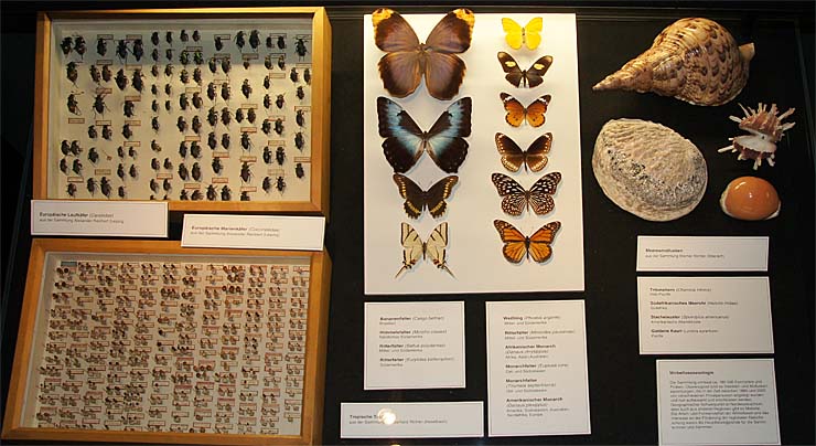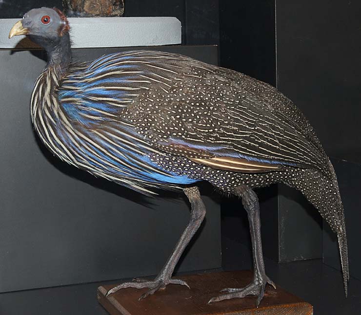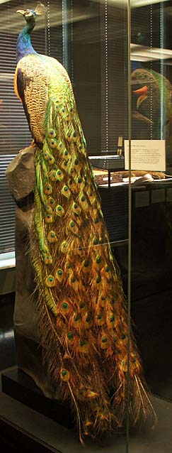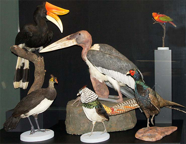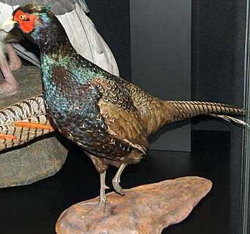 | Diamant- oder Amherstfasan Chrysolophus amherstiae Osttibet, 1915 Die Heimat des Diamantfasans sind die Berg- und Bambuswälder Westchinas, Tibets und Myanmars. Das Nahrungsspektrum ist breit gefächert, sowohl pflanzliche als auch tierische Nahrung wird genutzt. Der Diamantfasan gehört auf Grund des farbenprächtigen Gefieders der Männchen zu den Vogelarten, die gern in Europa gehalten werden. In Großbritannien gibt es ausgewilderte Freilandvorkommen. Unser Exemplar ist ein Wildfang und gelangte über den Zoo Leipzig in die Sammlung. |