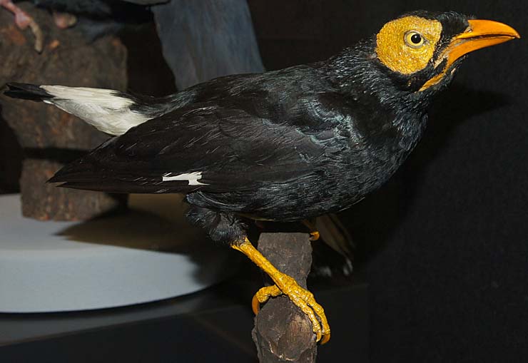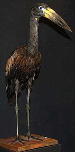 Schwarzer Klaffschnabel Anastomus lamelligerus Westafrika, vor 1868 Diese Storchenart kommt im tropischen Afrika in verschiedenen Feuchtgebieten vor. Bevorzugte Nahrung sind große Süßwasserschnecken, aber auch andere Wirbellose des Süßwassers sowie kleinere Frösche und Fische werden verzehrt. Klaffschnäbel sind oft mit Flusspferden vergesellschaftet, da diese Wasser und Schlamm aufwühlen und so die Nahrungssuche der Störche erleichtert wird. |