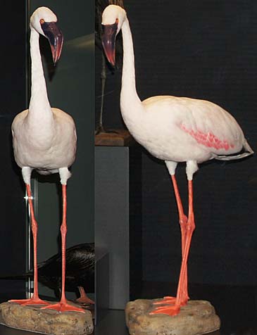 minor Die größten Vorkommen der Zwergflamingos sind von den Salz- und Sodaseen Ost- und Südafrikas bekannt. Da sie dort auf Grund des hohen Salzgehaltes und der extremen Temperaturen, mit Ausnahme anderer Flamingoarten, keine Nahrungskonkurrenten haben, können bis zu 1 Million Tiere gemeinsam leben. Ihre Nahrung, vor allem Blau- und Kieselalgen sowie kleine Krebstiere, filtern sie mit ihrem Schnabel aus dem Wasser. Die Rosafärbung entsteht durch Nahrungsinhaltsstoffe (Carotine). |