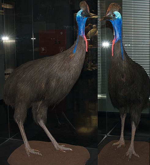 Helmkasuar Casuarius casuarius Neuguinea, 1858 Diese Straußenvögel leben auf Neuguinea, in Nordaustralien und auf einigen Inseln dieser Region. Sie ernähren sich sowohl von Pflanzen und Pilzen als auch von kleineren Wirbeltieren und Wirbellosen. Lebensräume sind unterholzreiche Regen- und Savannenwälder. Kasuare sind sehr wehrhafte Tiere, die ihr Revier mit schmerzhaften Tritten auch gegenüber Menschen verteidigen und ernsthafte Verletzungen verursachen können. >>mehr zur Restaurierung<< |