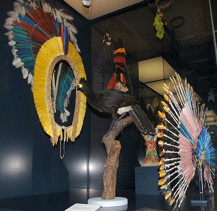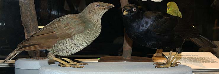 Kurzlappen-Schirmvogel Cephalopterus ornatus Pampayaco (Peru), 1829, gesammelt von Eduard Poeppig Der Kurzlappen-Schirmvogel gehört zu den Schmuckvögeln, die nur in Mittel- und Südamerika vorkommen. Seine Heimat ist das Amazonasbecken. Dort besiedelt er Waldgebiete entlang der Flüsse und Regenwälder in den unteren Lagen der Anden. Die Nahrung besteht vor allem aus Früchten, Insekten und kleinen Echsen. |