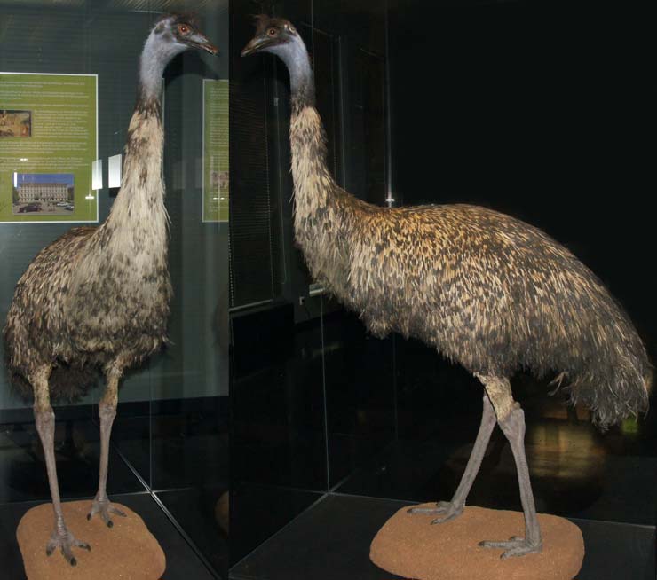 novaehollandiae Zoo Amsterdam, 1856 Der Emu ist die größte Vogelart Australiens. Die Verbreitung in den offenen Landschaften des Kontinents wird vom Zugang zu Süßwasser bestimmt. So profitieren diese Laufvögel auch von der Schafzucht und den deshalb von den Farmern angelegten Wasserstellen. Sie fehlen nur in Regionen mit dichten Wäldern und stark urbanisierten Gebieten. Die Nahrung besteht aus Pflanzen und Insekten. |
