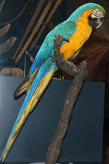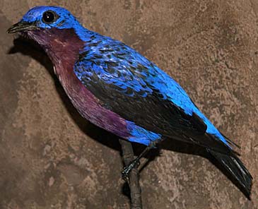 cotinga Maynas, Mission Tocache (Peru), 1830, gesammelt von Eduard Poeppig Dieser Schmuckvogel besiedelt das nördliche Südamerika von Peru bis zur Atlantikküste. Er lebt in den Baumkronen der Regenwälder. Über die Lebensweise ist wenig bekannt, ähnlich wie verwandte Arten dürfte er von Früchten und eventuell auch Insekten und ihren Larven leben. |