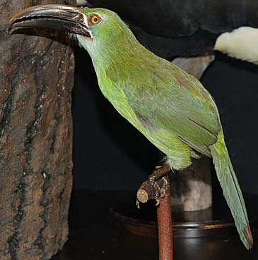 derbianus Pampayaco, Peru, 1829 Diese Tukanart lebt vor allem in den Anden von Südkolumbien bis Nordwestbolivien in subtropischen Regenwäldern bis in 2000m Höhe. Über die Lebensweise ist wenig bekannt, hauptsächlich besteht die Nahrung aus Früchten und Insekten, wie andere Tukane brütet auch der Derby-Arassari wohl in Baumhöhlen. Dieses Exemplar wurde von dem Leipziger Naturforscher Eduard Poeppig während seiner Südamerikareise gesammelt. |
