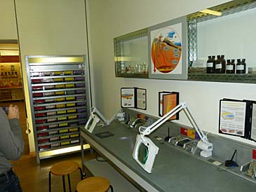 Schubkästen in die Hand und unter Lupen untersucht werden.