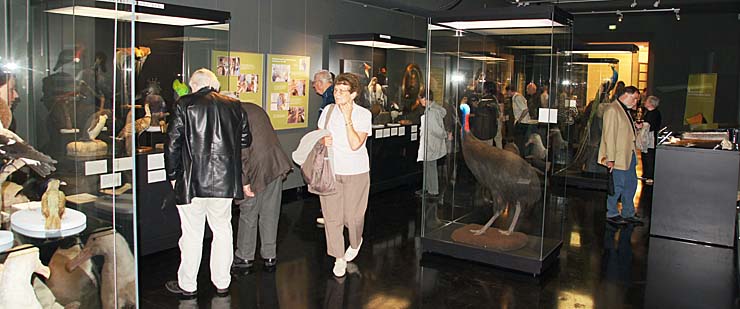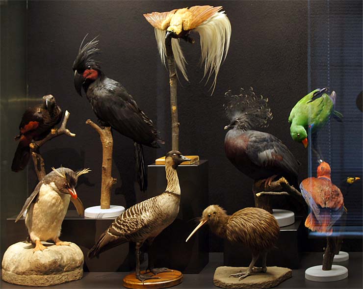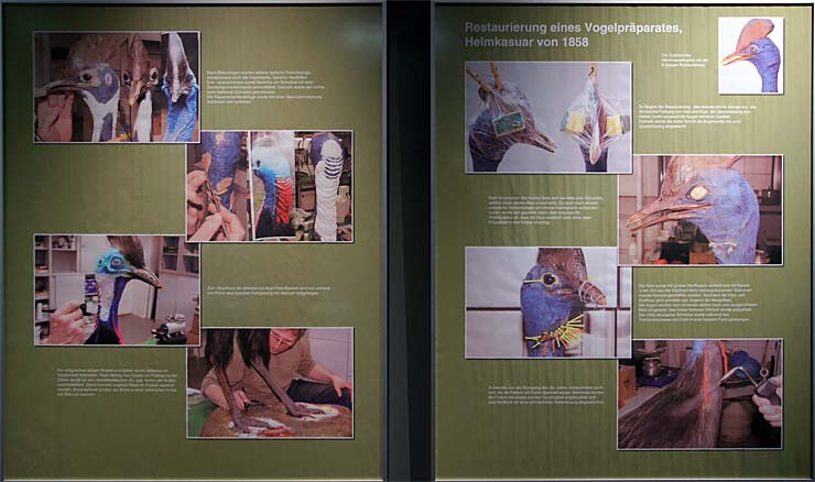 Helmkasuar Casuarius casuarius Neuguinea, 1858 Diese Straußenvögel leben auf Neuguinea, in Nordaustralien und auf einigen Inseln dieser Region. Sie ernähren sich sowohl von Pflanzen und Pilzen als auch von kleineren Wirbeltieren und Wirbellosen. Lebensräume sind unterholzreiche Regen- und Savannenwälder. Kasuare sind sehr wehrhafte Tiere, die ihr Revier mit schmerzhaften Tritten auch gegenüber Menschen verteidigen und ernsthafte Verletzungen verursachen können. >>mehr zur Restaurierung<< |