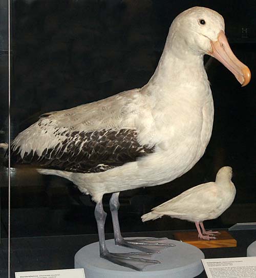 Wanderalbatros Diomedea exulans Deutsche Tiefsee-Expedition „Valdivia“ Südatlantik, 18.11.1898 Die Brutgebiete der Wanderalbatrosse sind die subantarktischen Inseln. Mit einer Spannweite von über 320 cm gehören sie zu den größten Seevögeln. Bevorzugte Nahrung sind Tintenfische. Auf Grund ihres Körperbaus können Albatrosse auch bei starkem Wind gut segeln, haben aber große Probleme beim Starten und Landen. Sie unternehmen sehr weite Wanderungen und suchen den festen Boden nur zum Brüten auf. |