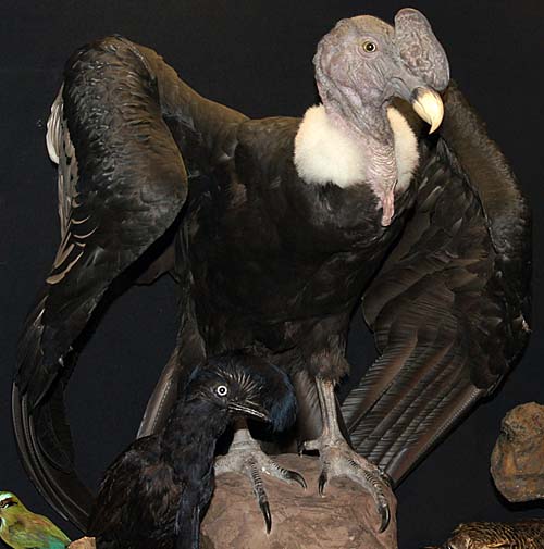 Andenkondor Vultur gryphus Lebensraum des größten Neuweltgeiers sind die Anden von Venezuela bis Feuerland. Er brütet auf Felssimsen und -plattformen. Die Eltern ziehen nur jedes zweite Jahr ein Junges auf. Hauptnahrung ist Aas. Trotzdem wurde der Andenkondor stark bejagt, so dass vor allem im nördlichen Südamerika nur noch wenige Tiere vorkommen und zur Sicherung der Bestände Wiederansiedlungsprojekte durchgeführt werden. In der Kultur südamerikanischer Völker spielt der Kondor eine bedeutende Rolle als Symbol des Himmels und der Freiheit. |